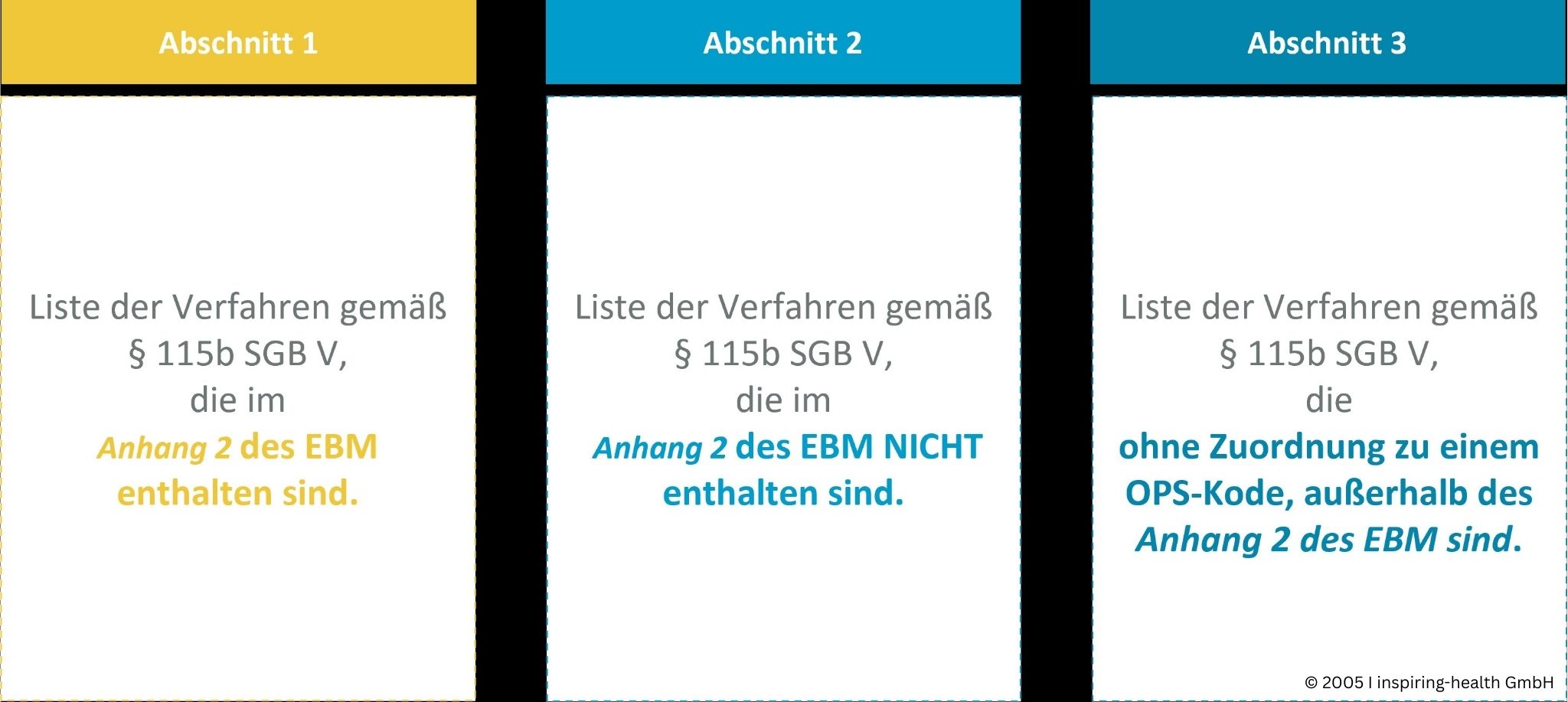 Abschnitt 2: Beinhaltet Leistungen gemäß §115b SGB V, die im EBM außerhalb des Anhangs 2 zu Kapitel 31 aufgeführt sind. Hier finden sich neben OPS-Kodes auch Angaben über die dazugehörigen EBM-Leistungen.
