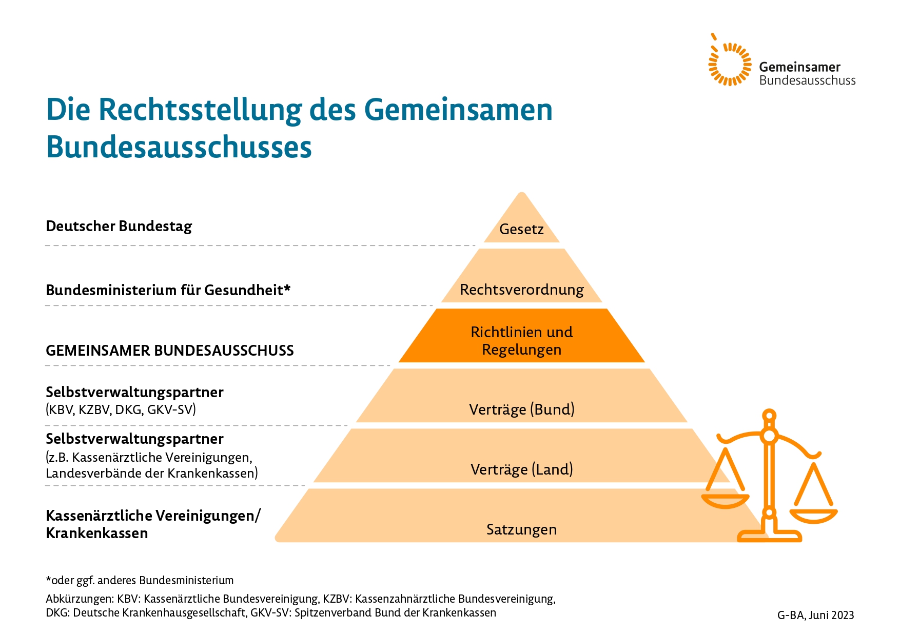 Die grundsätzlichen Entscheidungen zum Leistungsanspruch der gesetzlich Krankenversicherten trifft in Deutschland der Gesetzgeber. Mit der Aufgabe, den sogenannten Leistungskatalog der Krankenkassen nach dem allgemein anerkannten Stand der medizinischen Erkenntnisse zu konkretisieren, hat der Gesetzgeber den G-BA als höchstes Gremium der gemeinsamen Selbstverwaltung betraut. Das Bundesministerium für Gesundheit nimmt die Rechtsaufsicht wahr.